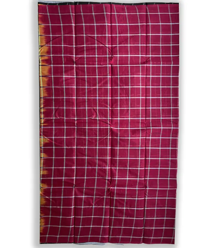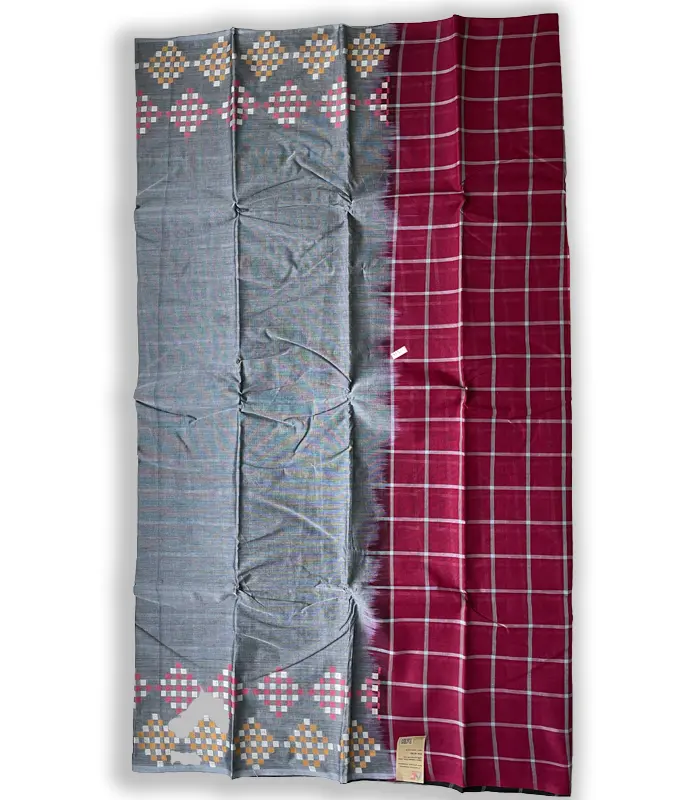 A beautiful design featuring a combination of Rectangle dots on the top and bottom with a gray body and a cherry/wine color pair, 100% authentic Tangail Tant Saree. Available in three different colors.